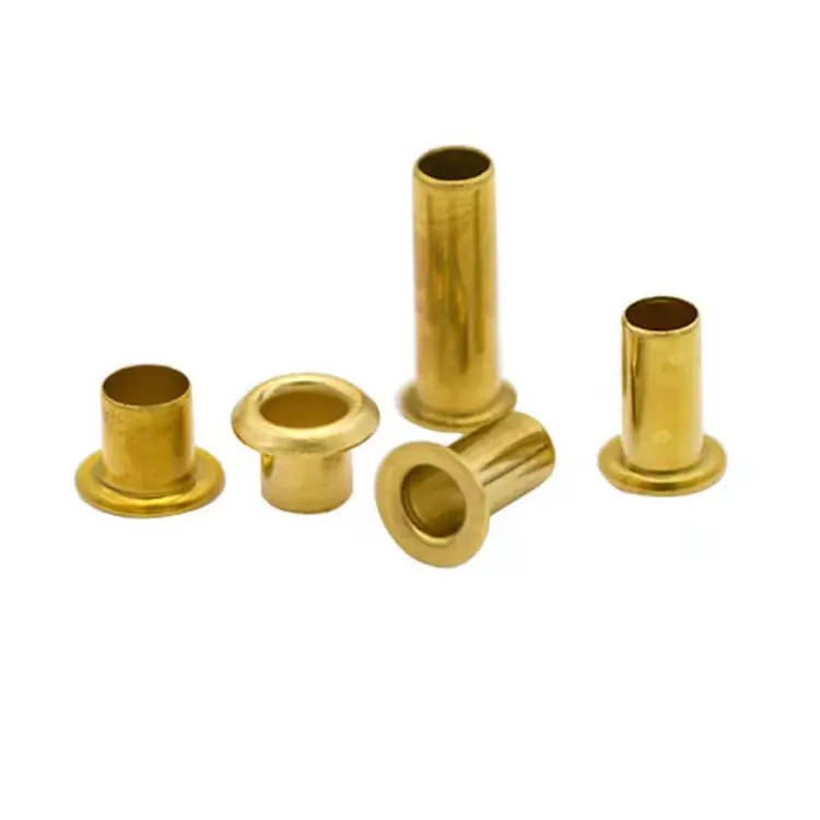 Материалы для заклепок с проушинами включают алюминий, латунь или сталь, каждый из которых имеет определенные преимущества с точки зрения коррозионной стойкости, прочности и стоимости. полые заклепки вкручиваются в предварительно пробитое отверстие, чтобы укрепить материал и обеспечить законченный край, широко используются в текстиле, кожаных изделиях, канцелярских товарах, брезенте, оконных занавесках и в рукоделии.